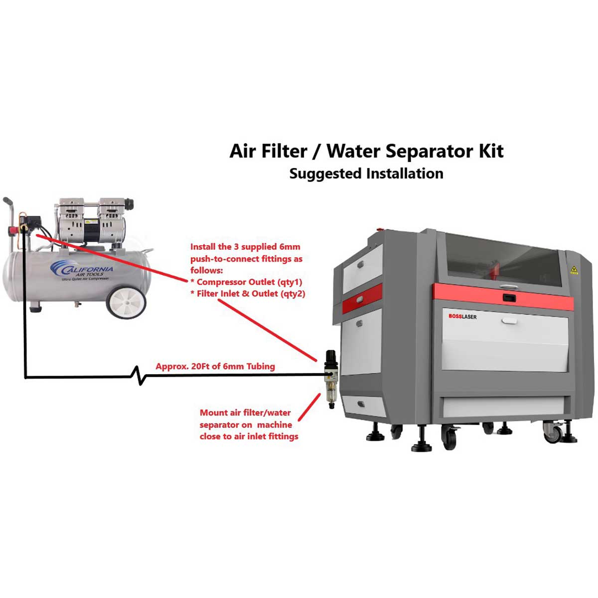 Boss Laser’s Air Filter / Water Separator Kit provides the correct components required to install on all our LS & HP CO2 laser machines.