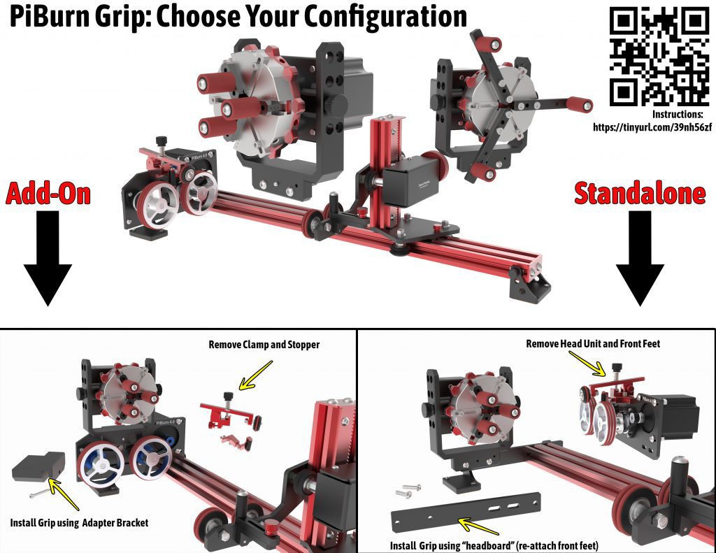 Have a PiBurn 3.0? Is your clamp arm (the hold-down arm with the wheel) metal? Great news! You can configure your PiBurn grip in both ways (shown below)